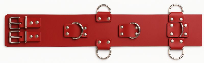 Der Gurt verfügt über zwei stabile, verschweißte Rollschnallen mit Stahlschlaufen sowie 5 D-Ringe und 6 O-Ringe (je 3 oben und 3 unten). Dadurch ergeben sich zahlreiche Kombinations- und Befestigungsmöglichkeiten für vielseitige Bondage-Anwendungen.