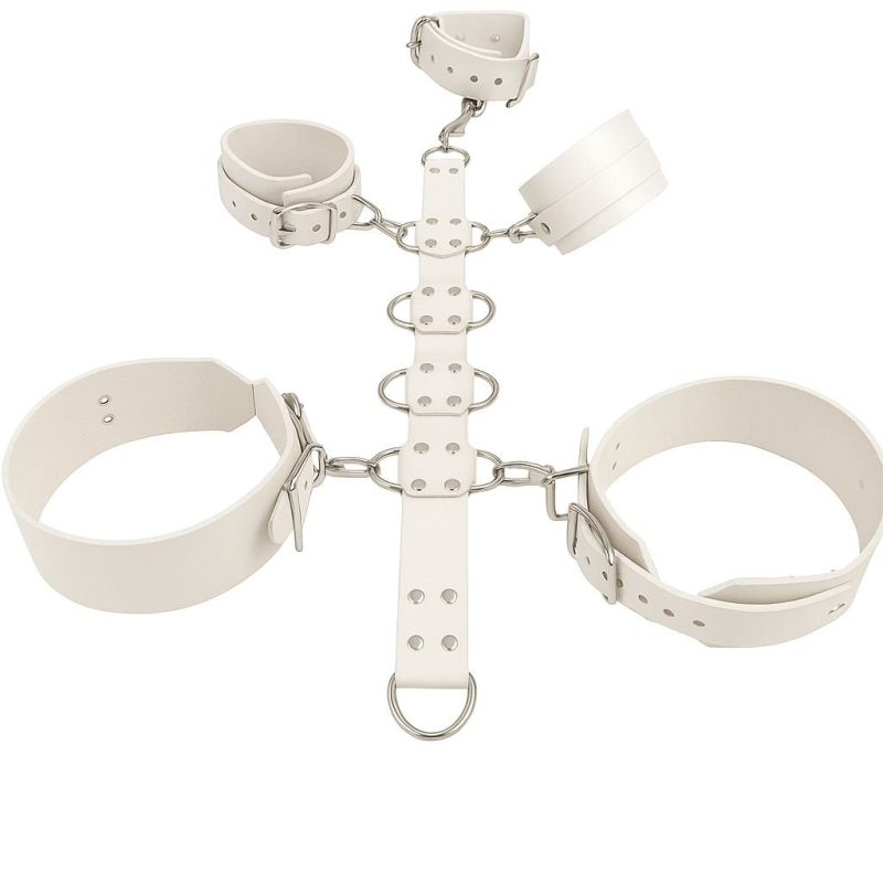 Premium BDSM Fesselset aus Echtleder: Dieses hochwertige Set kombiniert Halsfessel, Armfesseln und Oberschenkelfesseln mit einer stabilen Lederringleiste für flexible Bondage-Positionen. Perfekt für anspruchsvolle Nutzer, die Wert auf Qualität, Komfort und Sicherheit legen.
